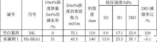 按上面步驟制備的減水劑進行配比,采用基準水泥或者代用的工程普通水泥,砂率39wt%,配合比(質量比)為水泥:砂子:碎石=330:720:1100,PE±SRA減水劑10wt%濃度摻量2wt%,通過調整用水量控制混凝土坍落度在90-145mm,檢測后得知,PE-SRA系列與PE+SRA系列的表面張力相近,但相同摻量條件下PE-SRA系列的減水率和減縮效果遠遠好于PE+SRA系列。