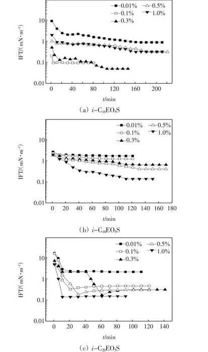(2)隨著NaCl質(zhì)量分?jǐn)?shù)的增加,3種表面活性劑的動(dòng)態(tài)界面張力曲線均可呈現(xiàn)“V”形,且個(gè)別表面活性劑的瞬時(shí)最低界面張力可達(dá)10-3mN/m數(shù)量級(jí)。