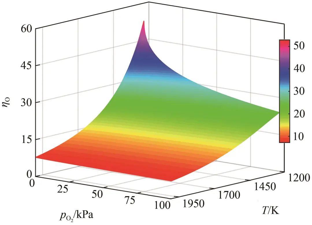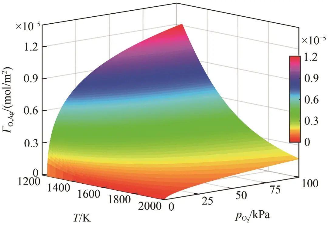 由圖7可知,當(dāng)溫度低于1500 K時,ΓO,Ag隨氧氣壓力升高顯著增加;當(dāng)溫度高于1500 K時,由于液態(tài)Ag-O系中的氧溶解度顯著降低,ΓO,Ag隨氧氣壓力的增加,其增加幅度減小。觀察圖8可知,η隨著溫度和氧分壓的升高而呈現(xiàn)下降趨勢。這是因?yàn)槭?27)中的表面偏析平衡系數(shù)KII與溫度呈負(fù)相關(guān),當(dāng)溫度升高時KII減小,導(dǎo)致表面氧濃度降低。此外,在較低的氧分壓條件下,O原子傾向富集于表面;當(dāng)氧分壓升高時,更多的O原子溶入液態(tài)Ag-O系中,引起η減小。
