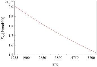通過式(9)計(jì)算了液態(tài)Ag的表面過剩熵SAg(T),結(jié)果如圖4所示。根據(jù)文獻(xiàn)[36],理論上處于更高無序程度(熵)的物質(zhì)狀態(tài)在較高溫度下更為穩(wěn)定,因此,液體表面結(jié)構(gòu)在較高溫度下可能會出現(xiàn)有序-無序轉(zhuǎn)變。然而,觀察圖4可知,在臨界溫度(6612 K)以下,SAg(T)隨溫度升高逐漸減小,這表明液態(tài)Ag表面總是保持有序結(jié)構(gòu)。與此同時,液態(tài)Ag表面原子堆積比率與Ag(111)晶面相同的假設(shè)也得到了支持。此外,根據(jù)式(9)可知,SAg(T)∝a1/T2+a2/T,a1和a2為系數(shù)。這與前人研究結(jié)果略有不同,文獻(xiàn)[37]基于Skapski模型推導(dǎo)得到SAg(T)∝a2/T,而文獻(xiàn)[38]則根據(jù)楊氏方程推出SAg(T)∝a1/T2。