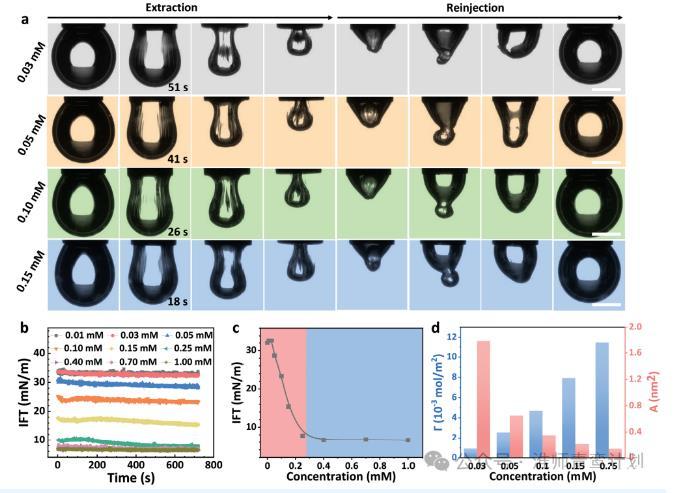 首先,在GL和SSD共組裝之前,用垂滴張力法研究了GL在水-甲苯中的界面行為。如圖1a所示,當提取濃度為0.03、0.05、0.10和0.15 mM的甲苯中GL水溶液的液滴時,分別在51、41、26和18 s時,液滴界面面積減小,在液滴界面上出現了明顯的起皺。同樣,當液滴完全虹吸到針管中并重新注入到初始體積時,起皺現象重新出現,液滴由不規則逐漸擴大到規則。抽注過程中起皺現象的出現,有力地揭示了水-甲苯界面處彈性膜的形成。圖1b測量了GL溶液和甲苯之間的時間分辨界面張力(IFT)。當GL濃度<0.03 mM時,甲苯與GL溶液之間的界面張力近似等于純水與甲苯之間的界面張力(≈32 mN·m?1)。隨著GL溶液濃度從0.03增加到0.25 mN·m?1,界面張力下降到6.8 mN·m?1,而從0.25到1.00 mM,界面張力保持在6.8 mN·m?1不變當GL濃度<0.03 mM時,甲苯與GL溶液之間的界面張力近似等于純水與甲苯之間的界面張力(≈32 mN·m?1)。隨著GL溶液濃度從0.03增加到0.25 mM,界面張力下降到6.8 mN·m?1,而從0.25到1.00 mM,界面張力保持在6.8 mN·m?1不變。據此,確定0.25 mM為GL分子在水-甲苯界面處的臨界膠束濃度(CMC)(圖1c)。這意味著液滴在GL的CMC以下會發生收縮,而在CMC以上液滴會發生起皺。為了進一步解釋這一現象,我們計算了不同濃度下GL分子的界面吸附容量和截面積。圖1d我們可以看到GL的界面吸附量隨濃度的增加成比例增加,相反,隨著濃度的增加,橫截面積減小。綜上所述,GL是一種特殊的兩親分子,可以在油水界面形成界面膜。
