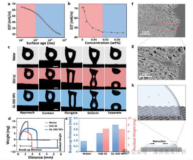 然后,作者研究了GL-SSD NPs液滴在疏水表面的沉積機理。先是測量了GL-SSD NPs溶液的動態表面張力(DST)和粘度。DST結果顯示,GL-SSD NPs溶液在前100 ms內發生輕微變化,這意味著GL-SSD NPs的擴散速率較慢,EST值隨著濃度從0到0.018 wt%的增加而減小到45 mN m?1,而當濃度高于0.018 wt%時,EST值保持不變。因此,0.018 wt%作為GL-SSD NPs的臨界膠束濃度(CMC)清楚地觀察到接近、接觸、伸長、變形和分離的順序過程。從PTFE表面分離后,水滴從表面被徹底清除,沒有留下任何殘留物,而SSD SC和GL-SSD NPs液滴在中間發生了明顯的伸長和斷裂,在表面保留了大量的液體。水、SSD SC和GL-SSD NPs的殘余質量分別為0.35、6.9和6.8 mg,而GL-SSD NPs溶液的破裂距離為2.43 mm,遠高于水和SSD SC的0.97 mm和1.68 mm,表明GLSSD NPs與PTFE表面的相互作用最強。此外,掃描電鏡(SEM)圖像顯示,撞擊后的縮回軌跡中留下了大量的液滴殘留物。在液滴撞擊過程中,大量GL-SSD NPs在三線處的沉積會利用PTFE表面固有的親水性改變其潤濕性,產生固定點,延緩液滴縮回。