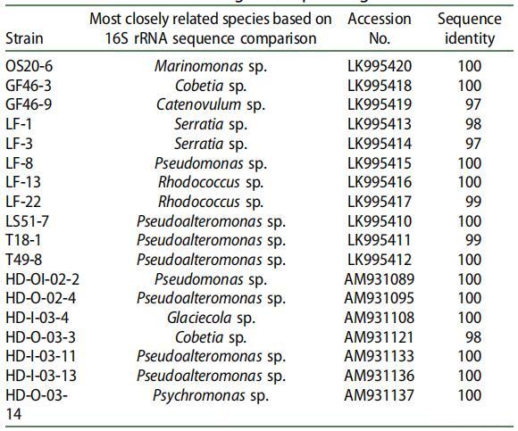 通過 16S rRNA 基因序列分析對具有顯著 SAC 活性的 18 個分離株進行分類鑒定(表 2)。 紅球菌除外。 菌株 LF-13 和紅球菌屬。 在菌株 LF-22 中,大多數鑒定的 SAC 生產者是革蘭氏陰性菌,屬于 γ-變形菌綱。 也有報道稱 γ-變形菌在寒冷海洋地區的石油污染地點占優勢。 [21-24] 先前對石油污染地點的研究表明,假單胞菌、假交替單胞菌、冰川、海藻和紅球菌是極地、海洋區域。[21,22,25-28]