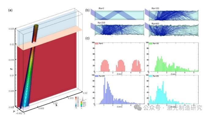 圖1.(A)計算區域和高斯熱源分布示意圖;(B)不同表面粗糙度下激光光線追蹤模型的驗證;(C)不同表面粗糙度下的反射點分布。