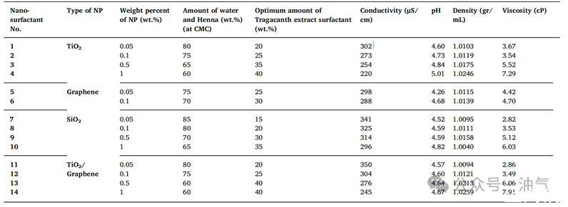 本研究研究了石墨烯、二氧化鈦(TiO2)和二氧化硅(SiO2)納米顆粒、TiO2和石墨烯的復合納米粒子以及指甲花提取物表面活性劑的納米復合物對降低油水界面張力的影響。研究人員使用溶膠-凝膠技術合成上述納米顆粒,并采用天然水性懸浮表面活性劑(黃芪膠提取物)對納米表面活性劑的穩(wěn)定性進行了研究。通過電導率、濁度和界面張力實驗測定了指甲花提取物表面活性劑的CMC值。為了穩(wěn)定重量百分比不同且納米顆粒類型也不同的納米表面活性劑,使用粒徑和zeta電位測量來確定黃芪膠表面活性劑各自的最佳濃度。最后,通過界面張力測量,使用穩(wěn)定的納米表面活性劑來研究其對IFT的影響。