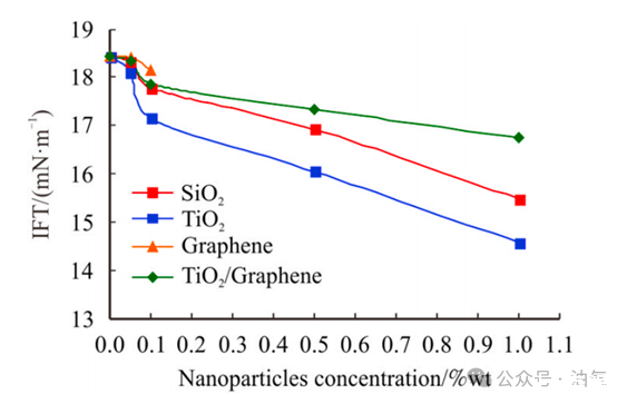5.單獨的石墨烯納米顆粒對降低油水界面張力的影響可以忽略不計。加之其與TiO2納米顆粒(純TiO2納米顆粒)合成TiO2/石墨烯納米復合材料時,不利于發(fā)揮作用。因此,石墨烯納米顆粒對EOR來說在操作上和經(jīng)濟上都不可行。