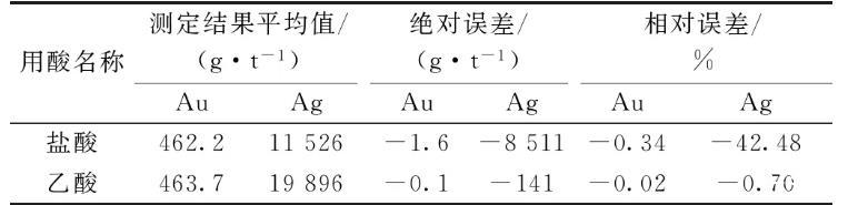 鉍氧化過程中,氧化鉍進入灰皿粉末吸收,粗鉍里面大部分金銀留在粉末上方,類似用灰皿灰吹。用硝酸溶解,固體物質(zhì)很快就溶解了,但金銀合粒也被溶解了,所以不能用硝酸溶解。用硫酸溶解,固體物質(zhì)和硫酸幾乎不反應(yīng),所以不能使用硫酸。用鹽酸和乙酸可以順利溶解固體物質(zhì),但鹽酸也溶解金、銀。實驗樣品金含量463.8 g/t,銀含量20 037 g/t,得到結(jié)果如表4所示,從表4可知使用乙酸溶解除鉍結(jié)果準確,所以選用乙酸作為溶解除鉍用酸。