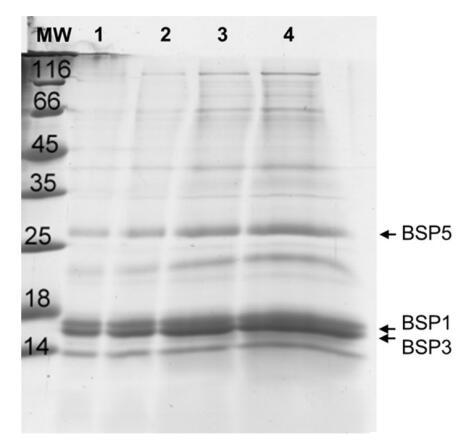 圖 1. 從牛精液中分離的精漿的 SDS-PAGE 凝膠和 以不同濃度沉積:泳道 1:1 ? G; 車道 2:2 ? G; 車道 3:5 ? g和車道 4:10? G。
