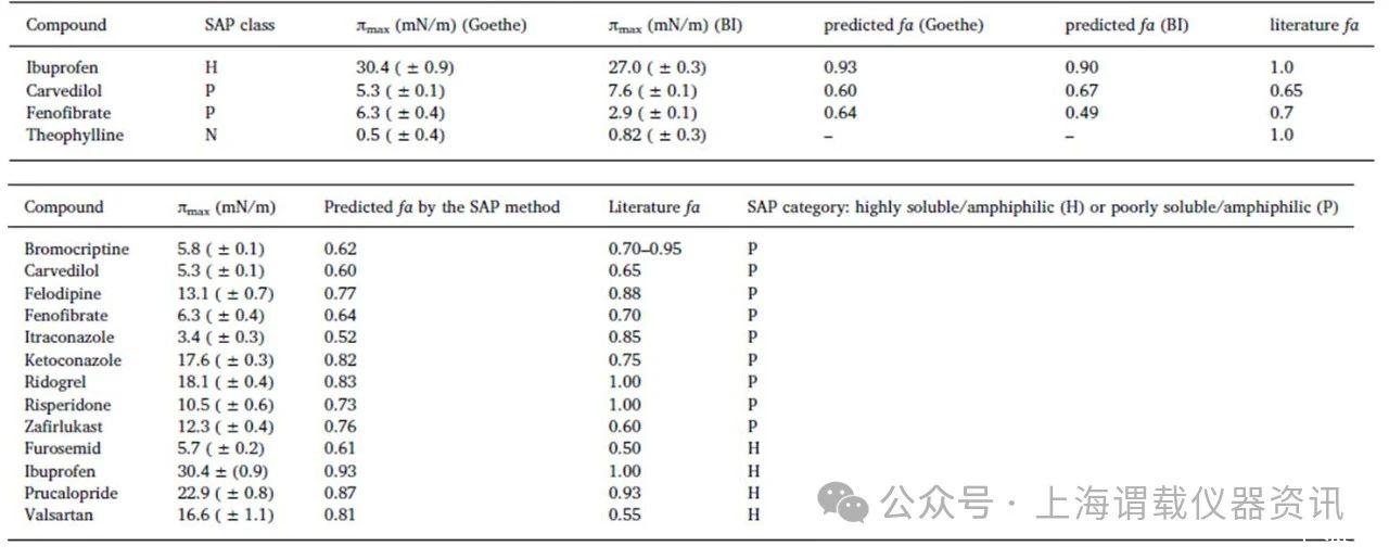 在LCs(先導藥物)的早期研究中,只有少量的化合物可用,如果化合物是兩親性的,SAP方法似乎是獲得fa的一個有效且快速的工具。只需要少量的LC原液的解決方案(50μl)通過Delta-8儀器進行分析,而沒有采用進一步分析如高效液相色譜法分析,高效液相色譜法盡管其簡單,能夠預測廣泛化合物的藥物的生物利用度(fa),包括高溶性和低溶性的兩親性化合物。而對于難溶性和高溶性兩親性化合物,改進的SAP(表面活性譜法)預測fa值與文獻報道的藥物分子的fa值相近。但是此方法不適合預測非兩親性藥物的fa值。