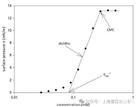 圖1、表面活性分析(SAP):增加一種兩親性物質的濃度會導致更高的表面壓力(π)。Kaw?1是空氣-水分配系數,CMC是臨界膠束濃度,dπ/dlnc斜率和描述物質在接口的橫截面積。