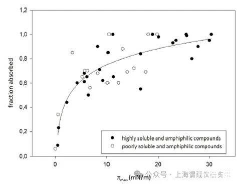 本論文研究人員提出了一種藥物活性分子生物利用度(fa)快速篩選方法-表面活性譜(SAP),作為替代傳統的動物研究和細胞培養篩選。研究人員使用SAP技術,主要是基于Kibron公司的高通量表面張力分析儀----(Delta-8),該儀器只需要50ul原液就能進行完整的滲透率分析。并將溶液中化合物的表面活性譜化合物與生物膜相互作用或穿透生物膜的潛力聯系起來。用于這種關聯的進一步參數包括臨界膠束濃度(CMC)、界面空氣/水分配系數(KAW?1)和分子在界面的面積要求,即截面面積(AS)等這些表面活性參數來獲取藥物的生物利用度(fa值)。此方法的提出對于先導化合物的早期篩選研究,因為先導化合物只有少量的化合物可用,SAP方法似乎是一個很有效和快速的工具,可以準確預測兩親性化合物的fa值,為新藥研發提供了重要的技術支持,這也說明高通量的表面張力分析儀(delta-8)在藥物研發方面發揮了重要的作用,尤其是預測活性藥物分子的生物利用度(fa)提供了一種新的技術手段。