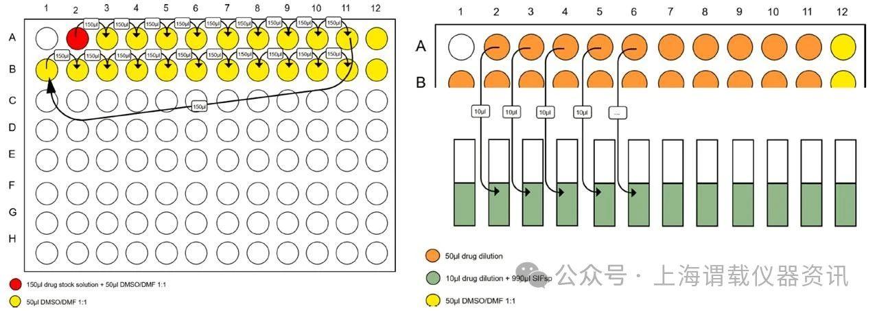 圖2、左邊的圖表示的是采用移液槍將樣品(難溶性的兩親化合物)轉移到kirbon公司的96孔板上測試其表面張力。右圖表示的是采用了改進的制備難溶性的兩親性化合物的表面張力的方法。