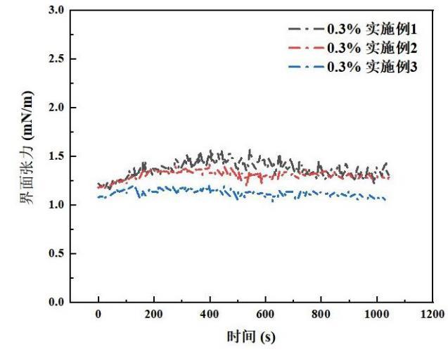 采用克呂士SDT旋轉(zhuǎn)滴界面張力儀分別測量原油(粘度723.7 mPa·s)滴入各實施例的地層水溶液后的界面張力(IFT),其中,各實施例在地層水中的質(zhì)量濃度為0.3%,并將原油滴入地層水中作為對照組進(jìn)行測量,測得對照組界面張力為21.6mN/m,其余各實施例測量結(jié)果如圖所示。可以看到,原油與三種實施例溶液混合后的體系的IFT可降低至1.25~1.46mN/m,證明了硅基納米原位乳化減阻劑具有良好的界面張力降低效果。