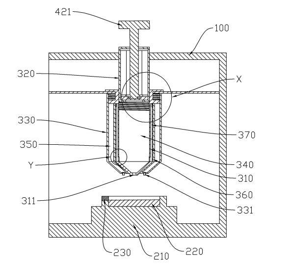 副筒320和滴液筒310之間限定出滴液腔340,滴液筒310上開設(shè)有出液口311,滴液腔340與出液口311連通。涂片臺200安裝于外殼100上,出液口311和涂片臺200在第一方向上依次設(shè)置,且當(dāng)出液口311滴出一個(gè)待檢測液的液滴時(shí),液滴沿第一方向上靠近涂片臺200的一端能夠與涂片臺200接觸。外筒330上具有第一空腔350,外筒330上開設(shè)有進(jìn)氣口331,進(jìn)氣口331設(shè)置在出液口311外側(cè),進(jìn)氣口331與第一空腔350連通。滴液筒310繞第一方向轉(zhuǎn)動能夠分別促使副筒320和外筒330沿第一方向移動,且在進(jìn)行滴液操作時(shí),副筒320沿第一方向移動能夠使滴液腔340體積變小,外筒330沿第一方向移動能夠使第一空腔350體積變大。