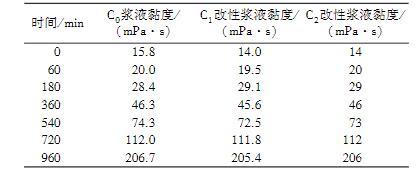 3.1表面活性劑對(duì)漿液黏度時(shí)變性的影響研究3種漿液在23℃條件下黏度隨時(shí)間變化關(guān)系見(jiàn)表2??梢钥闯觯?種漿液的黏度均隨時(shí)間的增長(zhǎng)而逐漸變大,表面活性劑對(duì)漿液的初始黏度以及不同時(shí)間的黏度影響很小(最大變化≤1.8mPa