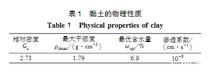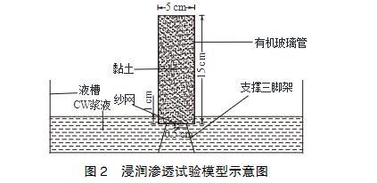 浸潤(rùn)滲透試驗(yàn)?zāi)P腿鐖D2所示,主要由液槽、支撐三腳架和透明有機(jī)玻璃管組成。有機(jī)玻璃管直徑5cm,高15cm,頂端敞開(kāi),底部封閉鉆有直徑0.5cm的進(jìn)漿孔。試驗(yàn)時(shí)將黏土裝入有機(jī)玻璃管中,振搗壓實(shí),底部開(kāi)孔處墊有紗網(wǎng),防止土體掉落。將有機(jī)玻璃管和支撐三腳架放入漿液槽內(nèi),有機(jī)玻璃管底部浸入漿液液面以下1.0cm,使?jié){液從底部滲入黏土中,通過(guò)觀察漿液在不同時(shí)間的滲透高度來(lái)評(píng)價(jià)漿液的浸潤(rùn)滲透效果。