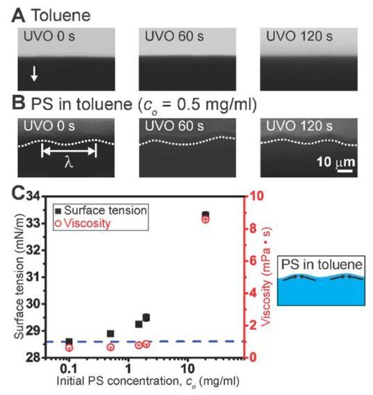圖 2 (A) 僅通過(guò)流涂的甲苯的彎液面前端。 箭頭表示流動(dòng)后退方向。 (B) 彎月面 聚苯乙烯(PS)在甲苯中通過(guò)流涂的前面。 白色的 虛線是眼睛的指南,半月板前面跟隨 k 的周期波長(zhǎng)。 (C) 表面張力和粘度作為 初始 PS 濃度的函數(shù)。 藍(lán)色虛線表示甲苯的表面張力。 示意圖說(shuō)明 可能由表面張力梯度引起的流動(dòng)(由 濃度梯度)用于在彎月面蒸發(fā)前沿的甲苯中的 PS。