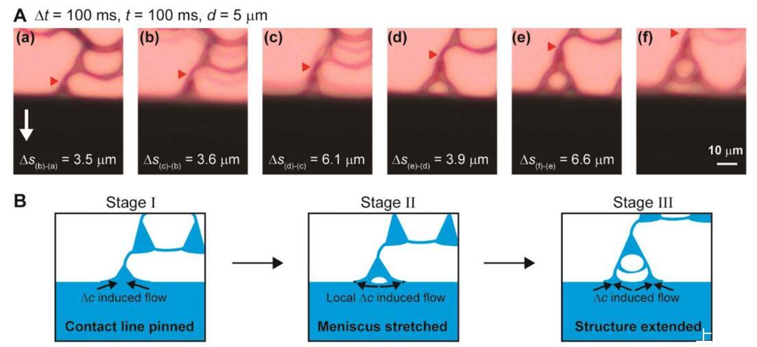 揭示自發(fā)結(jié)構(gòu)形成的細(xì)節(jié) 超支化結(jié)構(gòu),我們采用原位顯微鏡[圖。 3(A)]。 視頻圖像顯示超分支 結(jié)構(gòu)通常分三個(gè)階段形成[圖。 3(B)]。 我們注意到,由于我們的彎液面的動(dòng)態(tài) 過(guò)程中,我們很難測(cè)量波長(zhǎng) 動(dòng)態(tài)彎液面。 在第一階段,手指平行于 由于馬蘭戈尼不穩(wěn)定性而出現(xiàn)流動(dòng)方向 和摩擦。 重要的是,三角形半月板將手指連接到半月板前部。 由于手指是 與本體溶液相比,PS 的濃度更高, 手指的表面張力相對(duì)較高,拉入 本體溶液,具有較低的表面張力。 這一步是 如圖3(B)(a)所示。