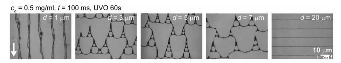 圖 4 PS 模式作為設(shè)定距離 d 的函數(shù),具有常數(shù) co (co 5 0.5 mg/mL)、t (t 5 100 ms) 和 UVO 暴露時(shí)間 (60 秒)。 白色箭頭表示流動(dòng)后退方向。