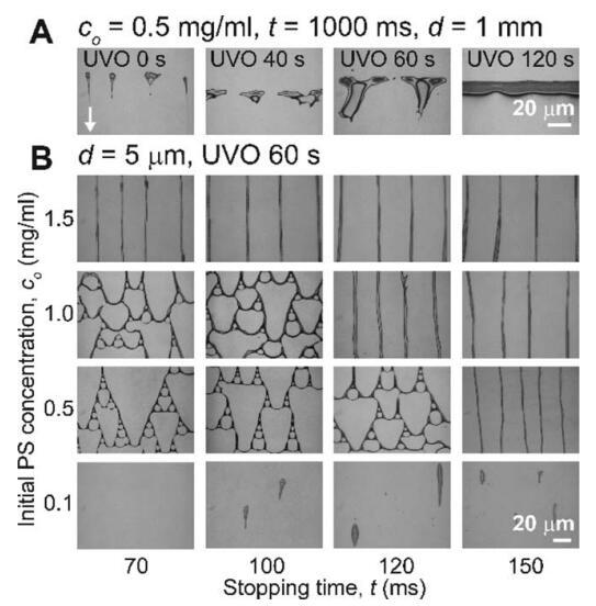 圖 5 (A) PS 圖案作為 UVO 曝光時(shí)間的函數(shù) 具有恒定的初始 PS 濃度 (co 5 0.5 mg/mL)、停止時(shí)間 (t 5 1000 ms) 和設(shè)置距離 (d 5 1 mm)。 這 白色箭頭表示流動(dòng)后退方向。 (二) 聚苯乙烯 模式作為 co 和 t 的函數(shù),同時(shí)保持不變 距離 (d 5 5 lm) 和 60 秒的 UVO 曝光時(shí)間。