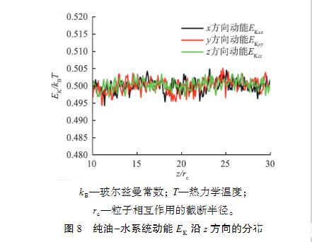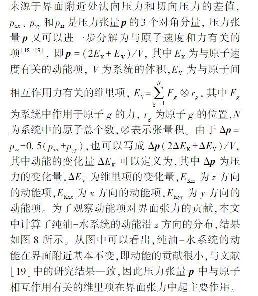 在界面張力的模擬計算公式(5)中,界面張力來源于界面附近處法向壓力和切向壓力的差值,pxx、pyy和pzz是壓力張量p的3個對角分量,壓力張量p又可以進一步分解為與原子速度和力有關的項,即p=(2EK+EV)/V,其中EK為與原子速度有關的動能項,V為系統的體積,EV為與原子間相互作用力有關的維里項,EV=∑Ng=1Fg?rg,其中Fg為系統中作用于原子g的力,rg為原子g的位置,N為系統中的原子總個數,?表示張量積。由于Δp=pzz-0.5(pxx+pyy),也可以寫成Δp(2ΔEK+ΔEV)/V,其中動能的變化量ΔEK可以定義為,其中Δp為壓力的變化量,ΔEV為維里項的變化量,EKzz為z方向的動能項,EKxx為x方向的動能項,EKyy為y方向的動能項。為了觀察動能項對界面張力的貢獻,本文中計算了純油-水系統的動能沿z方向的分布,結果如圖8所示。從圖中可以看出,純油-水系統的動能在界面附近基本不變,即動能的貢獻很小,與文獻中的研究結果一致,因此壓力張量p中與原子相互作用有關的維里項在界面張力中起主要作用。因為壓力張量中的動能項對壓力影響很小。