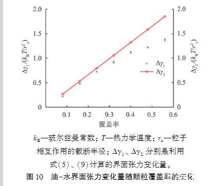 圖10油-水界面張力變化量隨顆粒覆蓋率的變化第二種方法是考慮所有因素對界面張力的影響,利用式(5)計算界面張力的變化Δγ1,如圖10中的黑點所示,黑點中的誤差棒是獨立計算多次結果得到的誤差。隨著顆粒覆蓋率的增加,界面張力降幅增大。Δγ1和Δγ2的變化趨勢是一致的,都是隨著界面覆蓋率的增大,界面張力降幅增大。在覆蓋率較小時,由于顆粒數量較少,在界面分布較為稀疏,使得顆粒間相互作用不明顯,因此顆粒間相互作用對界面張力的計算沒有太大的影響,Δγ1和Δγ2變化趨勢基本一致。隨著覆蓋率的增大,Δγ2>Δγ1。由于直接利用吸附能和吸附顆粒數量計算界面張力存在明顯的局限性,因此接下來要進一步研究顆粒間相互作用對界面張力的影響。