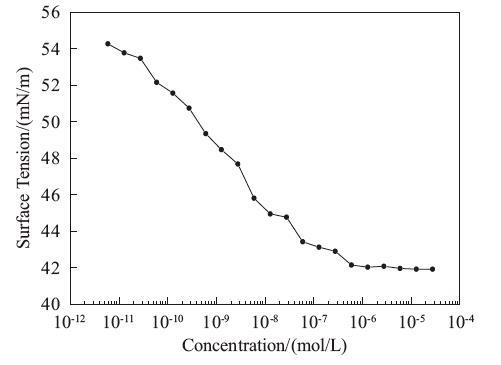 HS-PA的γ-c曲線如圖2所示。從圖2中可以看出,在純水中,HS-PA的臨界膠束濃度約為3×10-7 mol/L(即0.012 g/L),表面張力最低可降至42.06 mN/m。與其他文獻報道的改性聚丙烯酸/酯高分子表面活性劑相比,HS-PA的γcmc屬于中等水平。大多數高分子表面活性劑的表面活性比較差,這可能是由于其分子量大,分子鏈易于卷曲,分子內或分子間的纏繞較為復雜,疏水鏈易于被親水鏈覆蓋。在洗滌劑配方中作為主表面活性劑的低分子量表面活性劑,其表面張力大多在35 mN/m以下。因此,HS-PA更適合作為輔助型高分子表面活性劑在洗滌劑中發揮作用。
