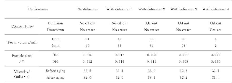 消泡劑的消泡能力與乳液的相容性成反比關(guān)系。消泡劑1和2與乳液的相容性最好,但因為部分溶解于乳液中,使消泡強度減弱;而消泡劑4與乳液的相容性最差,雖然具有極強的消泡性,但是因為過于疏水而難與乳液相容,所以容易造成表面缺陷。消泡劑3與乳液的相容性與消泡能力較為平衡,是最佳的消泡劑選擇。