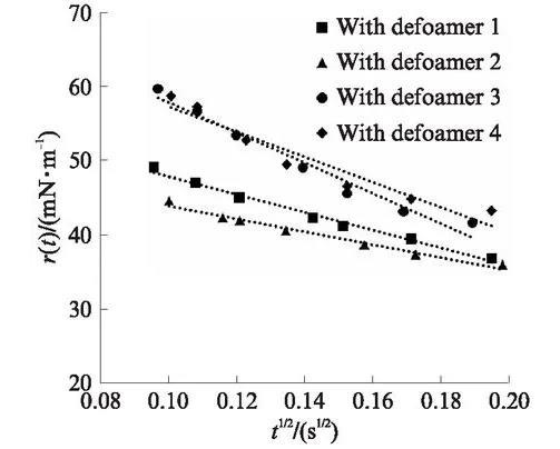 擴散系數(shù)是指單位時間內(nèi)物質(zhì)通過單位擴散通道橫截面的質(zhì)量。擴散系數(shù)越大,物質(zhì)擴散能力越強。利用擬合曲線斜率代入式(1),可以求得消泡劑在起泡液中極短時間范圍的擴散系數(shù),消泡劑1、2、3、4的擴散系數(shù)D分別為4.67×10-6、2.43×10-6、1.33×10-5、9.24×10-6m2/s,在10-5到10-6數(shù)量級。