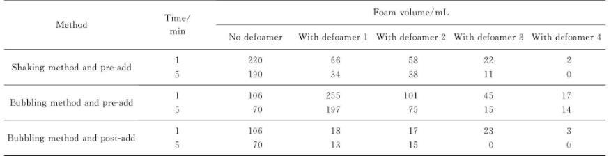 用鼓氣法研究了不同的消泡劑添加方式,由表1可以發(fā)現(xiàn)后添加方式比先添加方式的初始泡沫明顯降低。后添加方式的消泡劑大量聚集于泡沫表面,破壞了氣液界面的平衡。雖然在實際生產(chǎn)過程中以先添加方式為主,但試驗結(jié)果給出了制備工藝改進的思路。