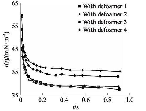 圖1是添加消泡劑后起泡液(0.2%二異辛基琥珀磺酸鈉鹽水溶液)的動態(tài)表面張力r(t)與時間t的關(guān)系圖。由圖1可以看出:在同樣的添加量下,分子級消泡劑(消泡劑1、2)可使起泡液具有更低的動態(tài)表面張力,這與其雙子結(jié)構(gòu)有關(guān);有機消泡劑(消泡劑3、4)在起泡物質(zhì)的協(xié)同作用下,也具有一定的降低起泡液動態(tài)表面張力的能力;在起泡液中,不論是加入分子級消泡劑還是有機消泡劑,在時間趨于1s時,其表面張力都低于36mN/m.