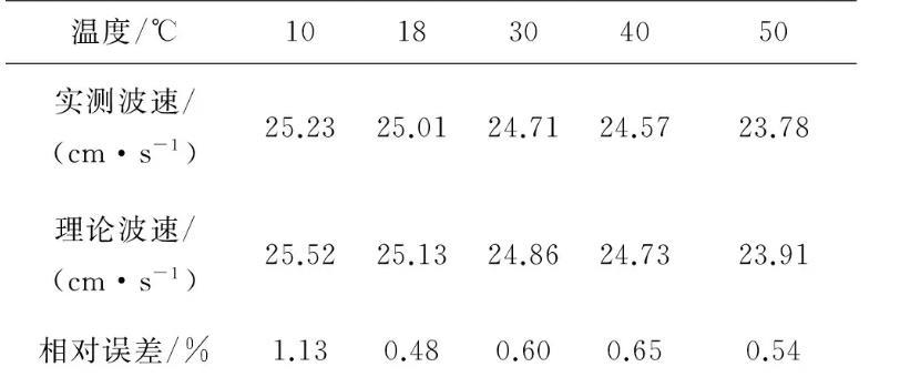 將之前得到的多組表面張力系數和波長數據代入式(1)中計算理論波速,再與實驗中的實測波速作比較,便可以通過實驗驗證水波波速與其表面張力關系公式的的正確性。在不同溫度下,實際測得的波速、由原理公式計算出的理論波速以及兩者的相對誤差數據列于表5。
