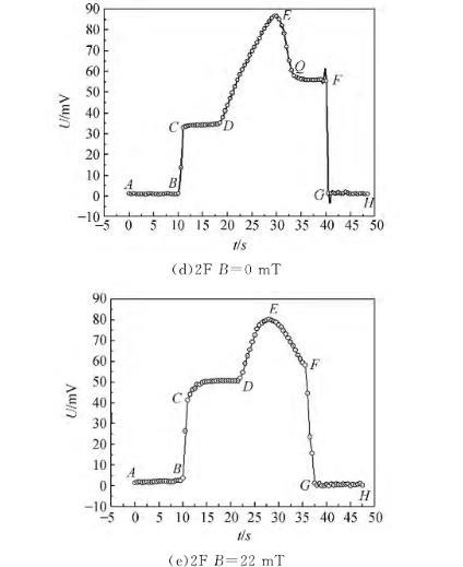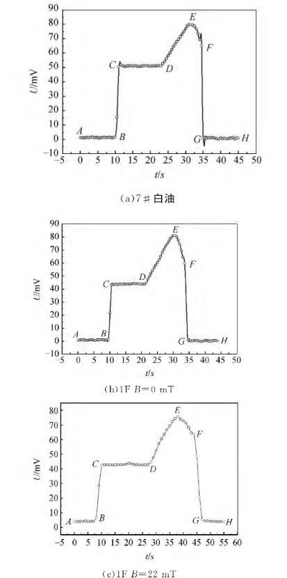 使用拉脫法測量了磁性液體的磁表面張力,無外加磁場作用時(shí),磁性液體的表面張力小于其載液的表面張力,磁性液體液膜拉得更長,液膜收縮的趨勢(shì)比白油更明顯,這主要是因?yàn)榇判砸后w中加入的表面活性劑降低了其表面張力。由液膜拉脫過程電壓變化曲線可觀察到:不同條件下磁性液體的電壓變化情況不同,無外加磁場作用時(shí)2F號(hào)磁性液體在EF階段存在轉(zhuǎn)折點(diǎn)Q,越過轉(zhuǎn)折點(diǎn),QF階段電壓變化較平緩,且表面張力越小;而7#白油和1F磁性液體并未出現(xiàn)此現(xiàn)象,這主要是因?yàn)?#白油和1F磁性液體表面張力較大,2F號(hào)磁性液體由于表面張力較小,其液體分子與分子之間的作用力較弱,宏觀表現(xiàn)為拉脫的液膜更長,液膜在空氣中會(huì)存在一段時(shí)間。有外加磁場作用時(shí),2F號(hào)磁性液體在FG階段并未出現(xiàn)電壓變化平緩的中間過程,但FG階段出現(xiàn)了另一些數(shù)據(jù)點(diǎn),液膜破裂的時(shí)間大于無外加磁場作用時(shí)的時(shí)間,主要是由于外加磁場增強(qiáng)了磁性顆粒之間的相互作用,分子和分子之間的磁吸引力增強(qiáng),導(dǎo)致液膜逐步破裂。