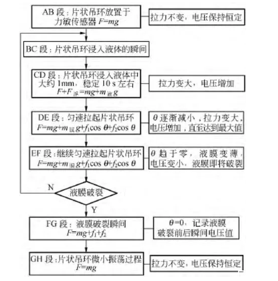 根據(jù)受力情況將圖4的液膜拉脫過程電壓變化曲線分為6個(gè)階段,圖5為液膜拉脫過程方框圖,不同階段片狀吊環(huán)的受力情況不同,電壓變化值也不同,在液膜破裂前后瞬間,忽略液膜的重力,表面張力與重力方向完全一致,此時(shí)F=mg+f1+f2,可得到液體的表面張力。由圖4發(fā)現(xiàn),不同液體在EF階段的電壓變化情況不同,無外加磁場作用時(shí)2F號(hào)磁性液體在EF階段存在轉(zhuǎn)折點(diǎn)Q,越過轉(zhuǎn)折點(diǎn),QF階段電壓變化較平緩,且表面張力越小;而7#白油和1F磁性液體并未出現(xiàn)此現(xiàn)象。出現(xiàn)該現(xiàn)象的原因是7#白油和1F磁性液體表面張力較大,當(dāng)液膜被拉脫到一定程度時(shí),很快破裂;而2F號(hào)磁性液體由于表面張力較小,液體分子與分子之間的作用力減弱,宏觀表現(xiàn)為拉脫的液膜更長,液膜在空氣中會(huì)存在一段時(shí)間,此時(shí)液膜質(zhì)量很小,可忽略不計(jì),電壓變化較平緩。有外加磁場作用時(shí),1F和2F號(hào)磁性液體在FG階段并未出現(xiàn)電壓變化平緩的中間過程,但有外加磁場作用于磁性液體時(shí),F(xiàn)G階段出現(xiàn)了一些數(shù)據(jù)點(diǎn),液膜破裂的時(shí)間大于無外加磁場作用時(shí)的時(shí)間,主要是由于外加磁場增強(qiáng)了磁性顆粒之間的相互作用,分子和分子之間的磁吸引力增強(qiáng),導(dǎo)致液膜逐步破裂。