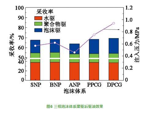 三相泡沫體系聚驅后驅油效果見圖6。由圖6可知,3支并聯巖心水驅采收率約為38%,聚驅采收率約為17%,聚驅后DPCG三相泡沫體系注入壓力和驅油效果最好,聚驅后采收率超過15%;PPCG體系次之,采收率超過14%。聚驅后SNP或BNP三相泡沫體系注入壓力和驅油效果相對較差,聚驅后采收率約為13%。聚驅后ANP三相泡沫體系注入壓力和驅油效果最差,但聚驅后采收率仍超過10%。