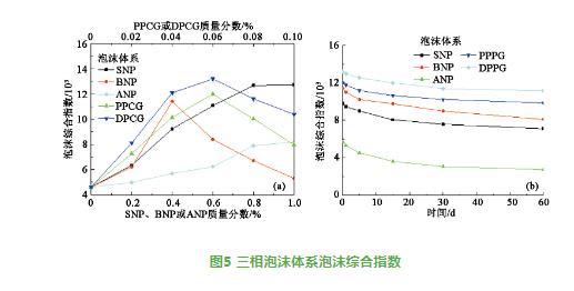 SNP三相泡沫體系氣液表面排布有DWS、聚合物和SNP-DWS;氣泡間液膜內,SNP與DWS親水基團靜電排斥作用,及聚合物增黏作用,使SNP懸浮在液膜內,液膜的厚度和黏彈性增加,導致泡沫穩定性、攜液量和攜液穩定性增加,泡沫綜合指數顯著增加。BNP三相泡沫體系氣液表面排布的DWS中嵌入少量BNP片狀結構和聚合物;氣泡間液膜內,BNP片狀結構與DWS和聚合物相互作用懸浮在液膜內,使液膜排液速度降低,泡沫歧化速度減緩,導致泡沫穩定性、攜液量和攜液穩定性增加,泡沫綜合指數明顯增加。而ANP與DWS和聚合物的作用相對較弱,其泡沫綜合指數相對較差。