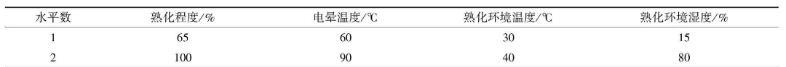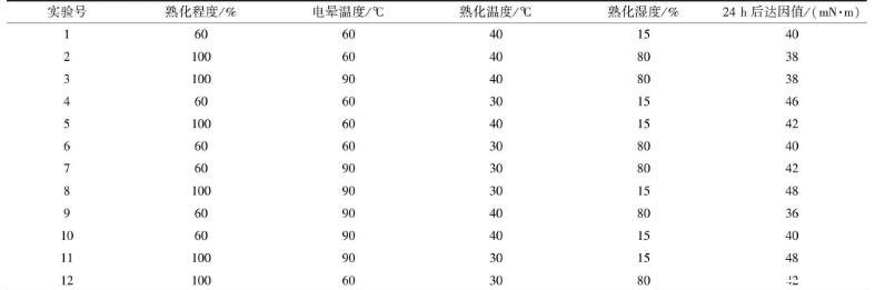 背板的表面張力受反應程度、電暈溫度、熟化環境溫濕度的影響較大,結合背板生產具體工藝參數,通過JMP軟件定制試驗設計四因子量連續水平的均勻試驗,如表2所示。