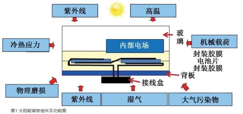 太陽能光伏背板位于光伏組件的背面,是光伏組件的重要組成部分,而背板作為直接與外部環境大面積接觸的光伏封裝材料,必須具備卓越的耐老化(濕熱、干熱、紫外)、耐電氣絕緣、水蒸氣阻隔、尺寸穩定等性能,為組件在各自長期惡劣環境下提供絕緣保護和支撐作用,如圖1所示。