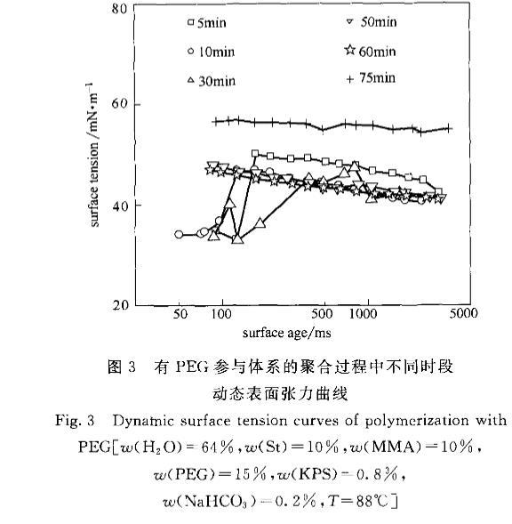 由于PEG的存在,使St/MMA在水相中經(jīng)歷了不一樣的聚合過(guò)程,PEG會(huì)使體系的反應(yīng)速率變慢,當(dāng)反應(yīng)到50min時(shí)轉(zhuǎn)化率只有49,而無(wú)PEG參與的體系在30min時(shí)聚合已接近終點(diǎn),轉(zhuǎn)化率達(dá)到98以上。St/MMA和引發(fā)劑形成的聚合物在PEG的作用下,形成了一種具有更強(qiáng)表面活性的聚合物,其表面活性水平高于PEG以及無(wú)PEG參與的聚合體系的聚合物,但弱于混合單體及齊聚物。這種較強(qiáng)表面活性的聚合物在轉(zhuǎn)化率只有5的時(shí)候就已經(jīng)存在,是聚合物進(jìn)入粒子堆形成小粒子且穩(wěn)定粒子的動(dòng)力,并最終使粒子帶有足夠脫離粒子堆的表面電荷。