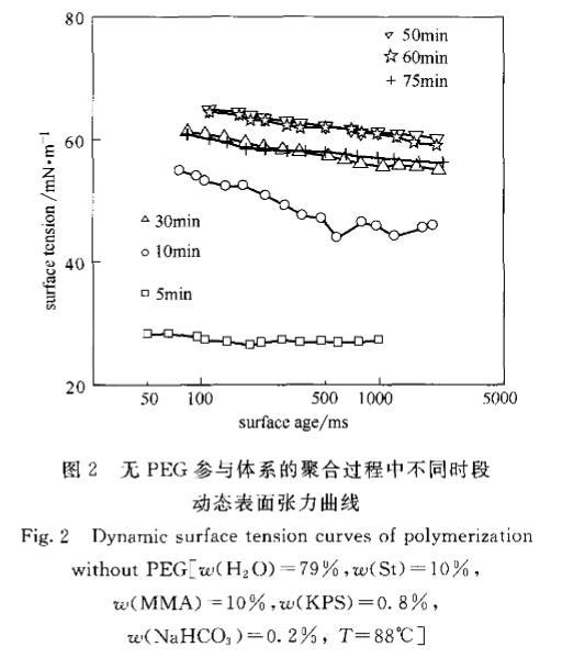 2.2聚合時(shí)間對(duì)動(dòng)態(tài)表面張力變化趨勢(shì)的影響經(jīng)引發(fā),水相中溶解的單體聚合成鏈,聚合體系的組分也隨之發(fā)生變化。體系在水相中含有了自由基齊聚物,以及由齊聚物聚集形成的基本粒子或膠束。這些新產(chǎn)生的物質(zhì)對(duì)DST曲線有很明顯的影響,加上PEG與聚合物鏈的相互作用,則使DST曲線有更多的變化。為了能明確地分析PEG在聚合過(guò)程中的作用,進(jìn)行了有PEG和無(wú)PEG參與的聚合體系各時(shí)間段動(dòng)態(tài)表面張力實(shí)驗(yàn)比較。圖2和圖3分別為St/MMA在無(wú)PEG的水中和有PEG的水溶液中DST隨聚合時(shí)間的變化趨勢(shì)。