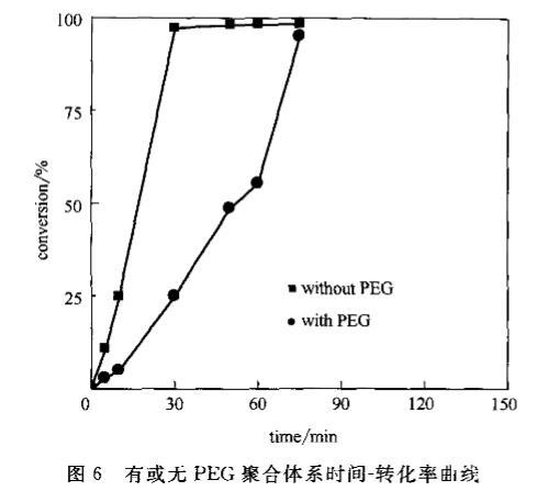 圖6有或無(wú)PEG聚合體系時(shí)間一轉(zhuǎn)化率曲線