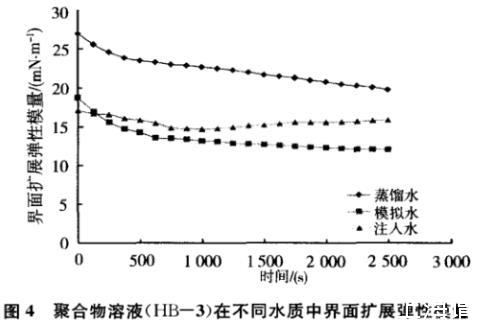 圖4聚合物溶液(HB-3)在不同水質中界面擴展彈性模量