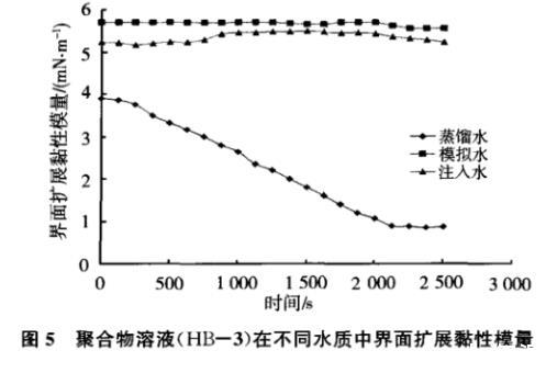 圖5聚合物溶液(HB-3)在不同水質中界面擴展黏性模量
