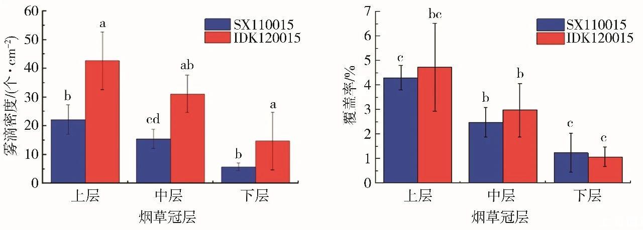 如圖4所示,與SX110015噴頭相比,IDK120015噴頭可提高藥液霧滴密度,煙草上、中、下冠層分別提高92.9%、101.6%和160.7%;在煙草上、中冠層藥液霧滴覆蓋率分別提高10.0%和20.2%,但在煙草下冠層藥液霧滴覆蓋率則降低13.8%。這是由于IDK120015噴頭孔徑小,藥液霧滴粒徑更細(xì),而SX110015噴頭的噴霧藥液霧滴的穿透性更強(qiáng)。因此,在使用時(shí)應(yīng)根據(jù)天氣條件和防治對(duì)象選擇合適類型的噴頭。