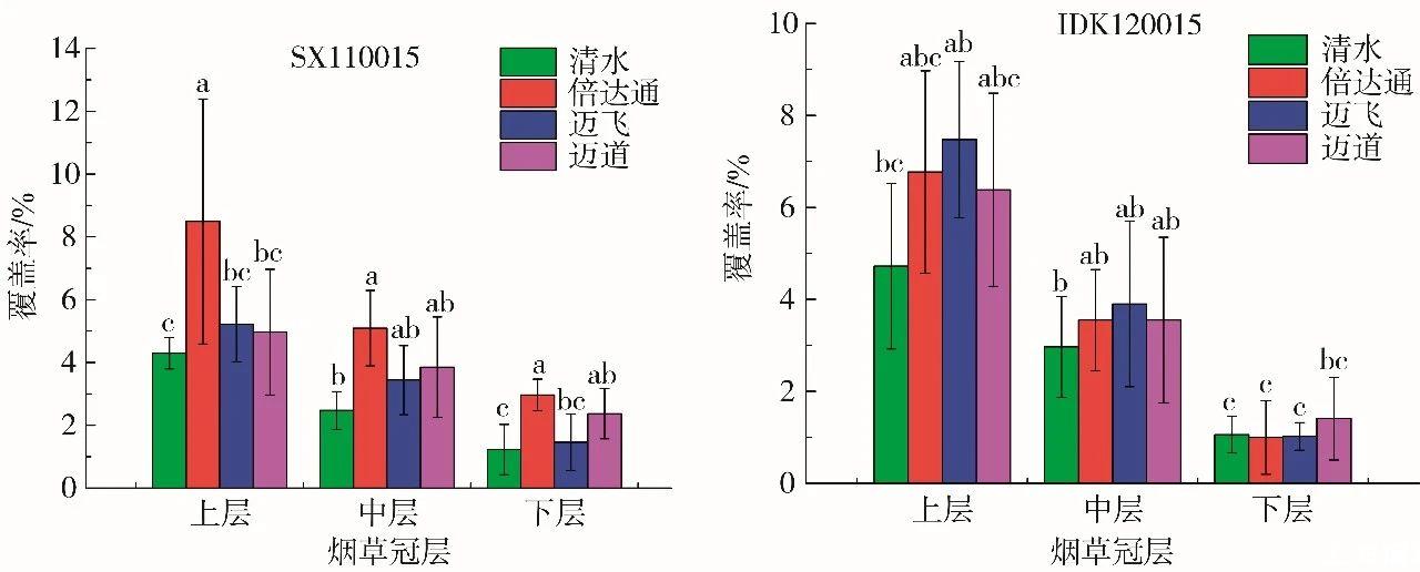如圖3所示,采用SX110015噴霧時(shí),添加助劑能夠顯著提高藥液霧滴在煙草上、中和下冠層的覆蓋率。其中,倍達(dá)通助劑的效果最為顯著,分別提高97.9%、106.1%和141.5%,而邁道對(duì)煙草下層的藥液霧滴覆蓋率提高92.7%。