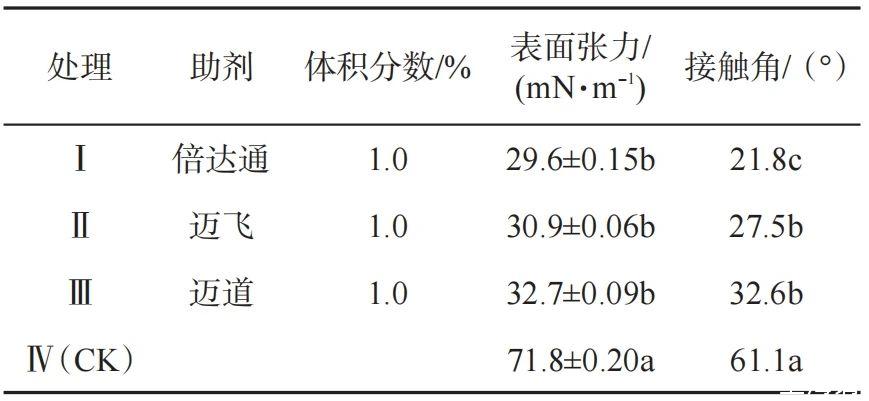 2.1添加助劑對(duì)藥液表面張力和接觸角的影響