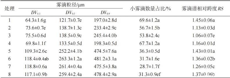 表4噴霧助劑及噴頭類型對(duì)藥液霧滴粒徑及分布的影響