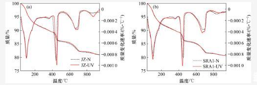通過TG-DTG程度對比分析60 d齡期時2種環(huán)境條件下水泥水化,熱重分析結(jié)果圖6和表4所示。化學(xué)結(jié)合水和氫氧化鈣的含量可以直觀地反映水化速率和水化程度。如表4所示,經(jīng)過強紫外線照射后,各組樣品的化學(xué)結(jié)合水含量和氫氧化鈣含量呈下降趨勢,這是因為強紫外線照射下樣品中的自由水會更快地蒸發(fā),最終導(dǎo)致水化程度降低。此外,對比2種環(huán)境下的碳酸鈣含量發(fā)現(xiàn),強紫外輻射會促進水泥石的碳化。熱重分析結(jié)果與已有的研究結(jié)果相似。