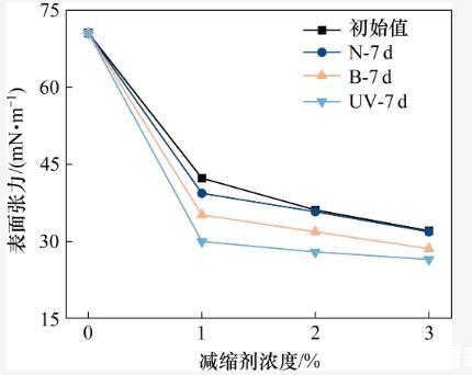 據(jù)以往研究,SRA在水泥基材料表面的吸附率通常在10%以下,90%以上的SRA分子溶于溶劑中(包含吸附在氣液界面上的部分)。因此,SRA減縮的理論基礎(chǔ)主要是毛細(xì)管張力理論。為了進一步探索減縮劑在強紫外線輻射環(huán)境下的作用機理,測試了減縮劑溶液的初始表面張力,以及溶液經(jīng)過3種不同環(huán)境(N,UV,B)處理7 d后的表面張力。試驗結(jié)果如圖8所示。