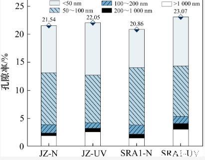 2)強紫外線輻射環(huán)境對不同組分水泥石干縮變形的影響不同。與基準(zhǔn)組相比,SRA試驗組的干縮值極大程度降低。然而,SRA促進了水泥石的水分散失,增大了水泥石體系中大于200 nm的大孔比例,由此帶來的結(jié)構(gòu)劣化問題不可忽視。